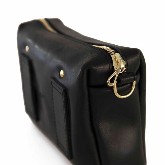 Erhältlich mit Gold oder Silber Beschlägen, Lederträger und Metallkette.