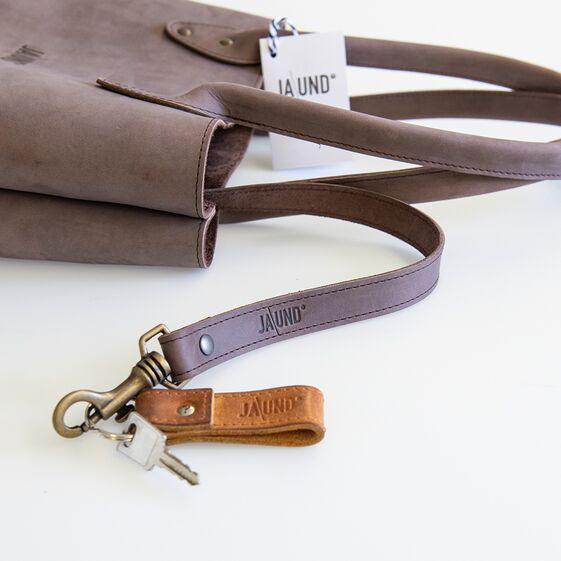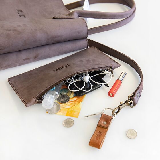 Eingearbeitetes Schlüsselband mit Karabiner und herausnehmbare Innentasche.