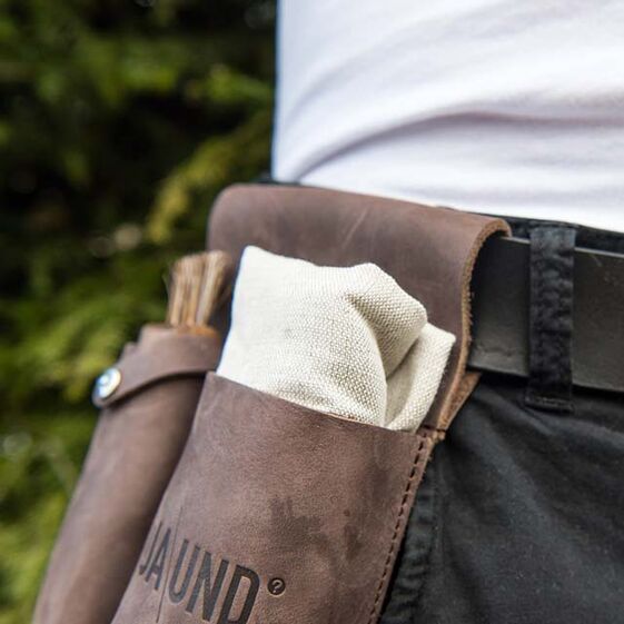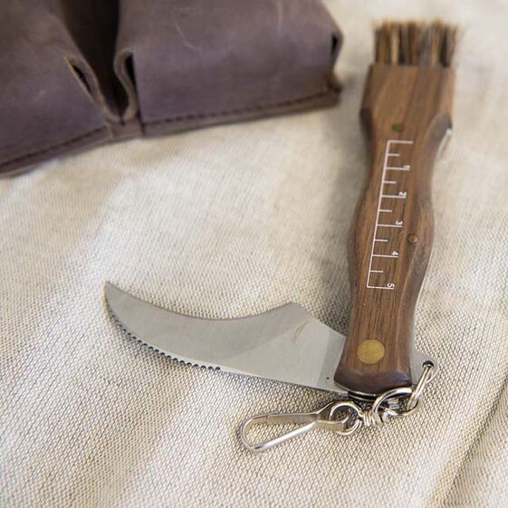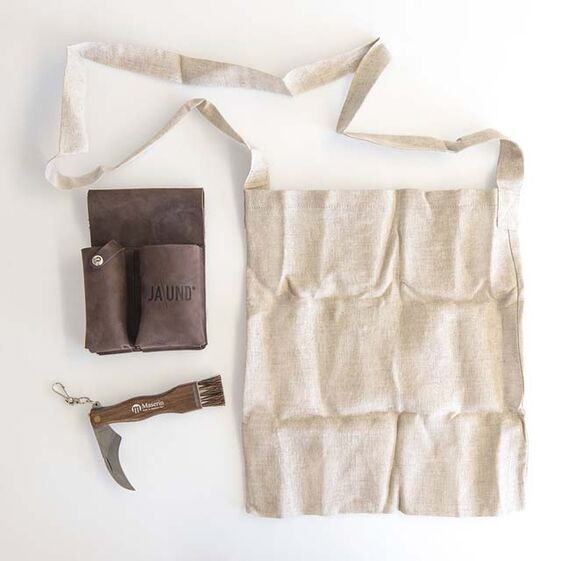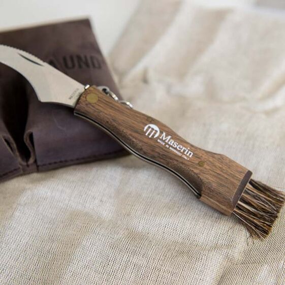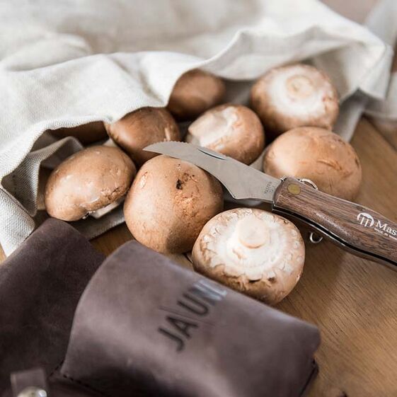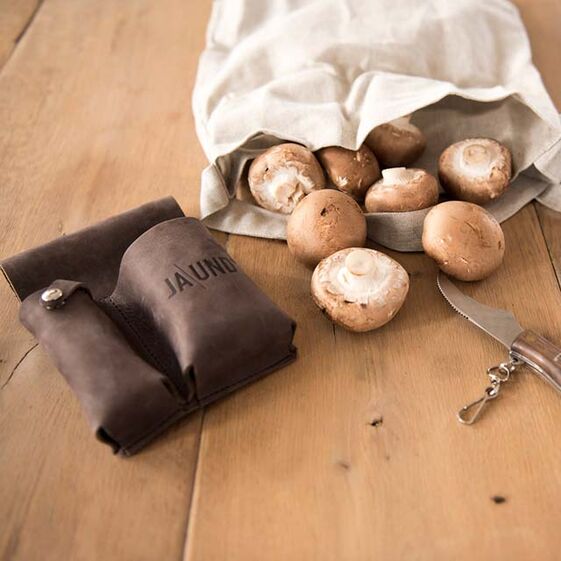 Lederetui mit hochwertigem Maserin®-Pilzmesser und Bio Halbleinen-Tasche (ca. 30 x 35 cm).